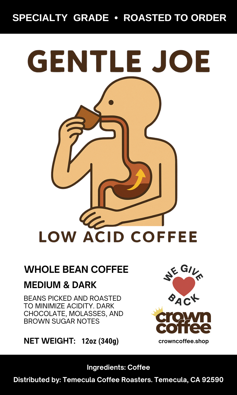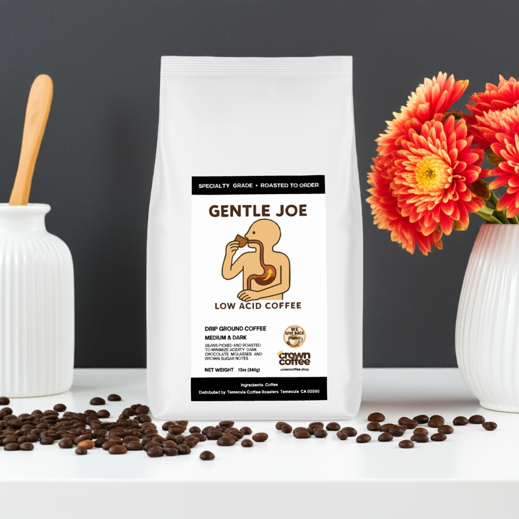 Experience Gentle Joe: The Perfect Coffee for Sensitive Stomachs. Enjoy rich, bold flavors without the discomfort of acidity. Our low-acid coffee, expertly crafted from specially selected beans, offers a symphony of dark chocolate, molasses, and brown sugar notes. Ideal for those with reflux or GERD, Gentle Joe lets you relish every cup, worry-free. Versatile for any brew, it's not just coffee, it's a revelation for sensitive coffee lovers. Elevate your coffee experience with Gentle Joe – where taste meets comfort.