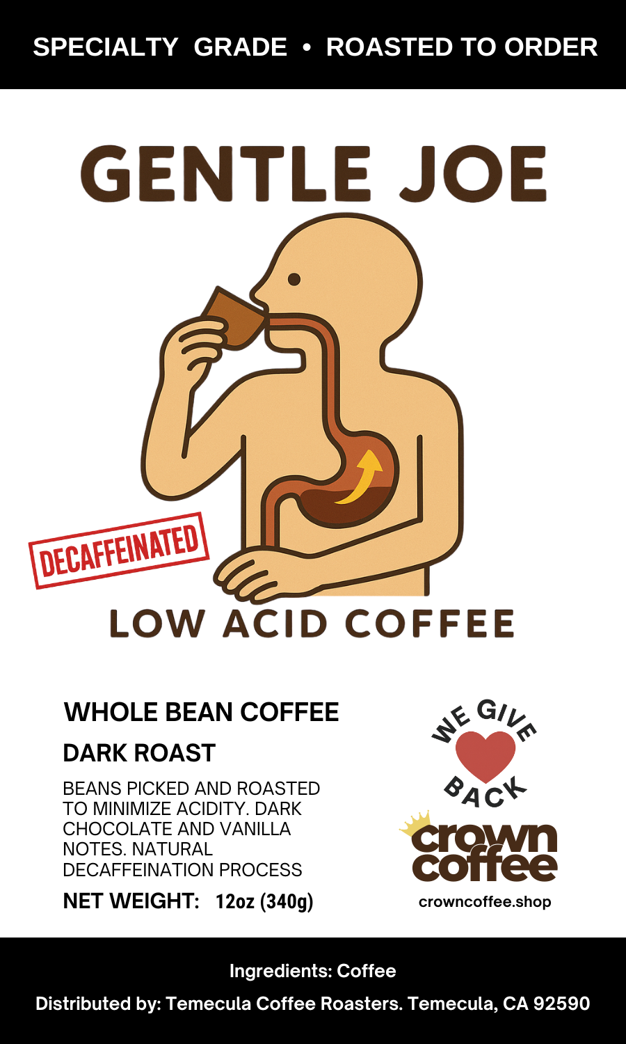 Indulge in a luxurious blend of dark chocolate and vanilla notes, perfect for any time of day. Gentle Joe Decaf is specially crafted for those with acidity concerns, offering a smooth, caffeine-free experience.